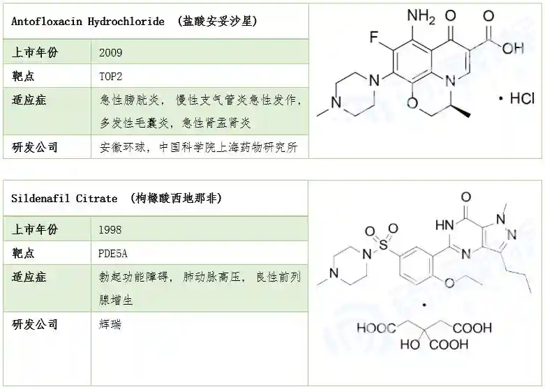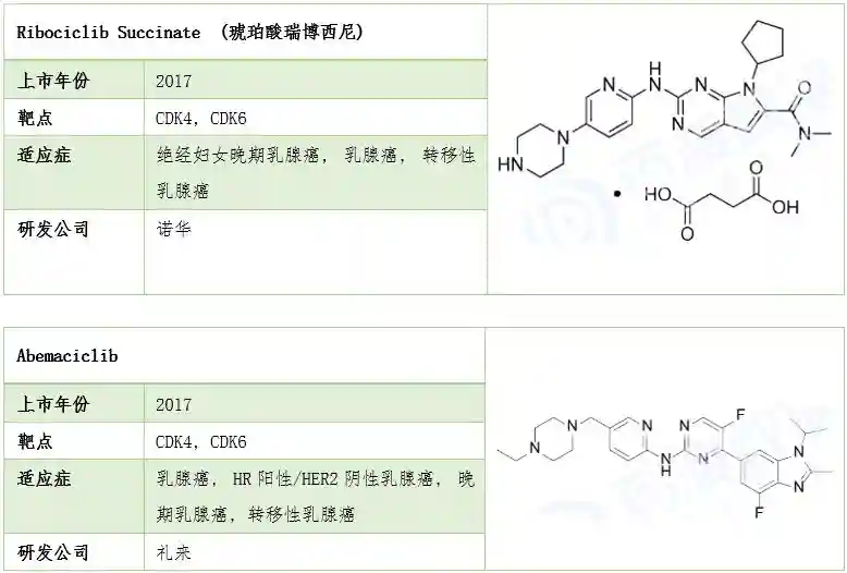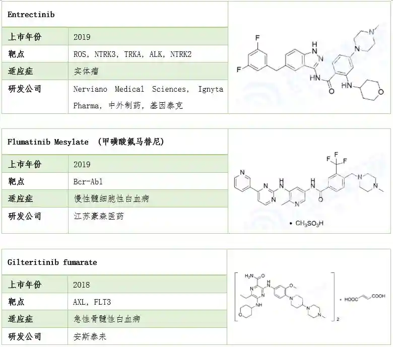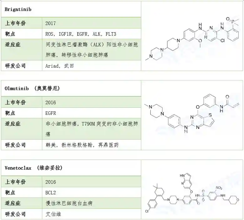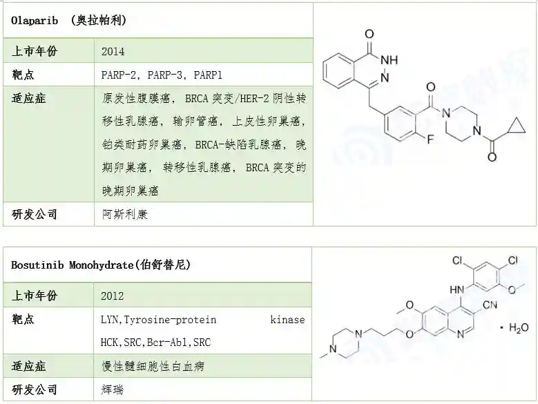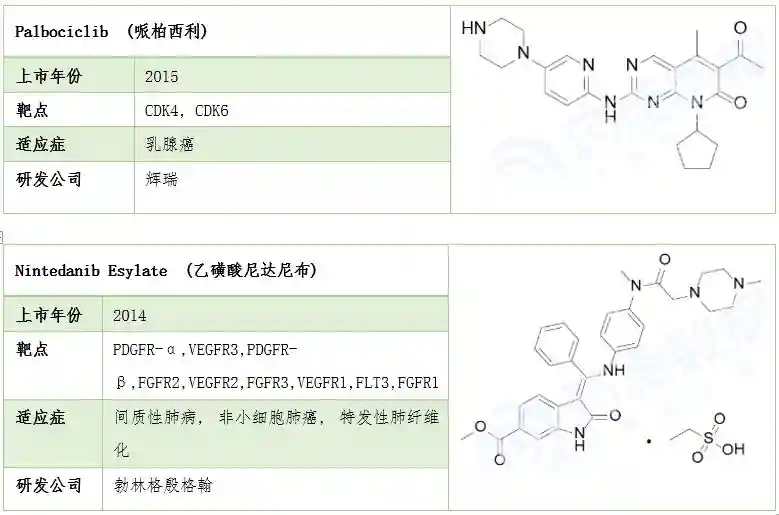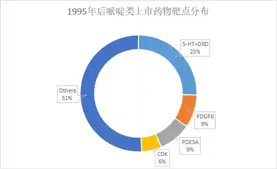 通过统计分析,可以看出近年来哌嗪这个结构骨架在抗肿瘤、抗感染、抗精神病等领域有了更多的应用,2015年后上市的哌嗪类新药大多为为抗肿瘤药物,除此之外还有一些新药出自抗精神障碍、肌肉疾病、感染类疾病、血液系统疾病等领域。下面,我们就来看一看近五年来一些代表性的哌嗪类药物都有哪些。由于篇幅所限,本文只展示1995年后上市的哌嗪类药物,它们的靶点分布情况见下图。