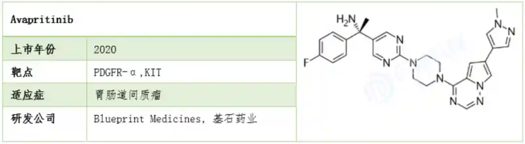 最新上市的Avapritinib由BluprintMedicines研发,于2020年1月9日获美国食品药品监督管理局(FDA)批准上市。该药是一种酪氨酸激酶抑制剂,靶向PDGFRA和PDGFRAD842突变体以及KIT外显子11、11/17和17突变体。本品被批准用于PDGFRA外显子18突变,包括PDGFRAD842V突变的不可切除或转移性胃肠道间质瘤(GIST)成人患者的治疗。一项单臂试验证实,avapritinib在PDGFRA外显子18突变(包括D842V突变)的晚期GIST患者中总缓解率(ORR)达86%,缓解持续时间达6个月以上的患者比例为60%[2]。