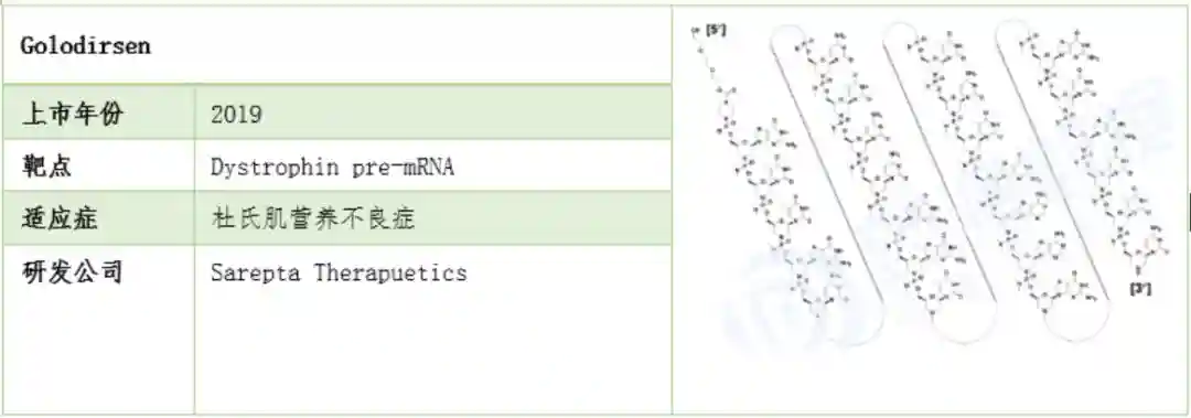 治疗杜氏肌营养不良症是哌嗪类药物的一大特色。该适应症目前仅有2个上市药物,哌嗪类Golodirsen是该适应症最新的上市药物。Golodirsen于2019年获美国FDA批准上市,该药是一种二氨基磷酸酯吗啉代寡聚体(PMO)亚类的反义寡核苷酸,可与肌营养不良蛋白前体mRNA的第53外显子结合,从而导致具有遗传突变且可跳过第53外显子的患者在mRNA加工过程中将该外显子排除在外。外显子53跳过旨在允许具有遗传突变且可适应外显子53跳过的患者产生内部截短的肌营养不良蛋白,因此该药被批准用于治疗杜氏肌营养不良。临床试验(NCT02310906)的结果证实,30mg/kg/周剂量的Golodirsen可使体内抗肌萎缩蛋白平均水平提高0.92%,与安慰剂相比效果显著()[3]。