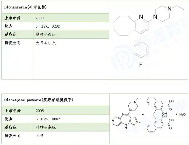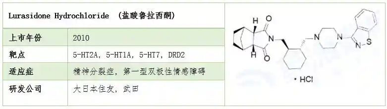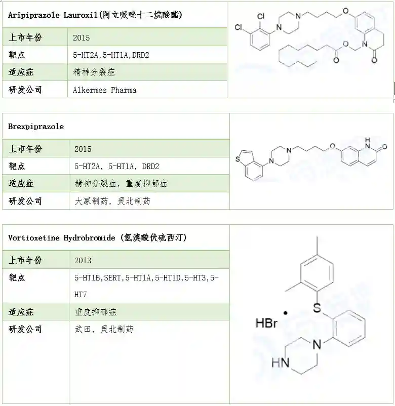 在抗精神病领域,卡利拉嗪可谓是哌嗪类药物的代表。Cariprazinehydrochloride于2015年9月17日获美国食品药品监督管理局(FDA)批准上市。该药通过5-HT1A受体和多巴胺D2受体的部分激动剂活性、血清素5-HT2A受体的拮抗剂活性联合介导。该药被批准用于治疗精神分裂症患者和双相Ⅰ型障碍相关的躁狂或混合发作患者。在精神分裂症、与双相I障碍相关的躁狂或混合发作和双相抑郁症等适应症的临床试验中,0.75-12mg/天剂量的卡利拉嗪组患者的PANSS、YMRS、MADRS等评分以及CGI-S均优于安慰剂组。根据年龄(55岁以上的患者很少),性别和种族对人群亚组进行检查,研究者未发现任何明显的疗效差异性证据[6]。不仅获得了临床试验的支持,卡利拉嗪在市场销售方面也有亮眼表现,据相关公司年报统计,在该药上市仅五年后的2019年,其销量已突破10亿美元[7],而一些已上市超10年,靶点和适应症均相似的药物如今销量却只是卡利拉嗪的1/8。