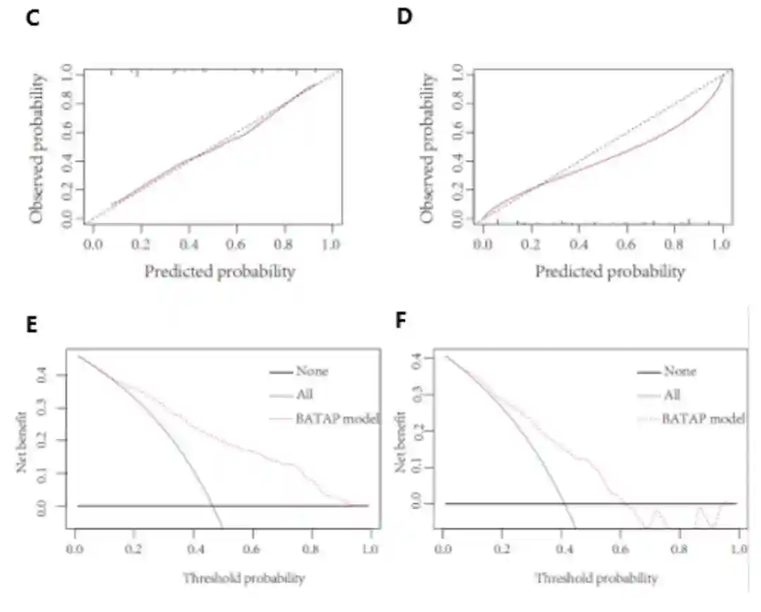 该模型在内部验证和时段外部验证中均展示了较理想的区分度(C统计量:内部验证:0.816[95%CI,0.766-0.867];外部验证:0.756[95%CI,0.696-0.817],ROC曲线见图2A-B)。校准度斜坡图提示模型预测概率与实际观测频率之间吻合良好(图2C-D)。决策曲线分析(DCA)显示利用该模型进行风险预测可带来可观的潜在获益(图2E-F)。