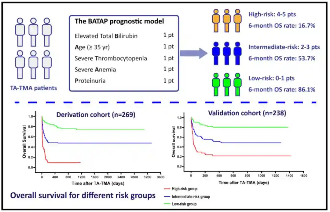 1.移植相关性血栓性微血管病(TA-TMA)是异基因造血干细胞移植(allo-HSCT)术后的严重并发症,且在病情活动程度和预后方面具有异质性。本研究首次探索了TA-TMA临床预后模型的开发和验证,有助于实现患病人群的早期预后分层和个体化干预。