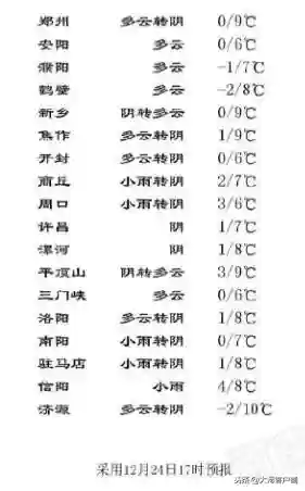 最低温度:西部山区、北部零下2°C到0°C;东南部3°C到5°C;其它地区0°C到2°C。最高温度:全省8°C到10°C。