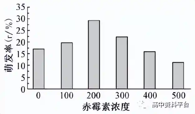 16.色木槭叶片颜色鲜艳,具有观赏价值,木材用途广泛,具有较高的经济价值,但是种子存在休眠现象。为探究不同浓度赤霉素对色木槭种子萌发的影响,研究小组分别用0、100、200、300、400、500mg/L的赤霉素浸泡六组种子24h,观察种子萌发情况,结果如图。下列相关分析正确的是