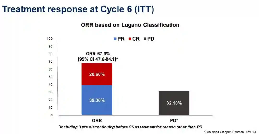 第6周期时,意向治疗人群的ORR为67.9%(19/28,达到主要终点),CR率为28.6%(图2)。没有临床特征影响C6-ORR。