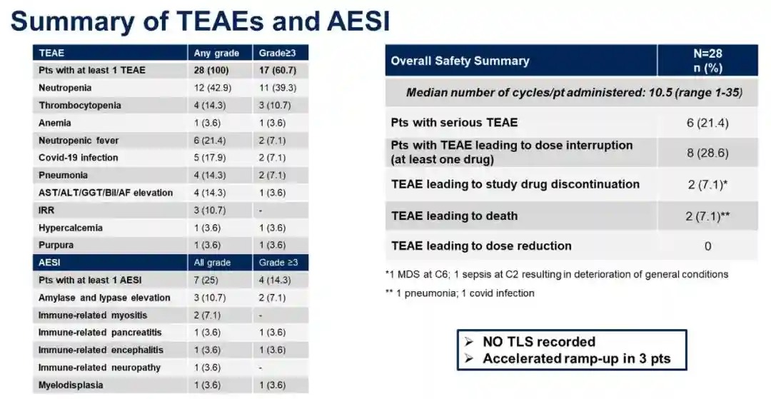 17例(60.7%)患者出现≥3级不良事件(AE),没有免疫相关AE导致停药。安全性特征详见表2。