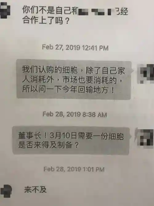2019年2月28日,露露像往常一样,在微信上向郝先生预约3月10日干细胞回输事宜,郝先生表示来不及。