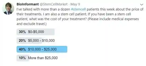 Twitter的民意调查结果显示,在干细胞治疗上的平均花费也是在5,000美元至25,000美元或更多。一般来说,治疗骨科疾病的费用较为便宜,而治疗慢性和复杂疾病的费用则相对较高。