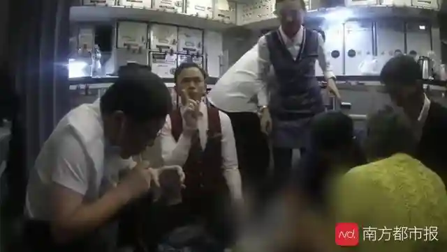 一位穿白衬衣、戴眼镜的男子利用机上材料自制了穿刺吸尿装置施救,用导管帮老人吸出约800毫升尿液,持续37分钟。这位吸尿救助的医生是暨南大学附属第一医院介入血管外科主任张红,另一名共同救助的医生是海南省人民医院血管外科主任肖占祥。