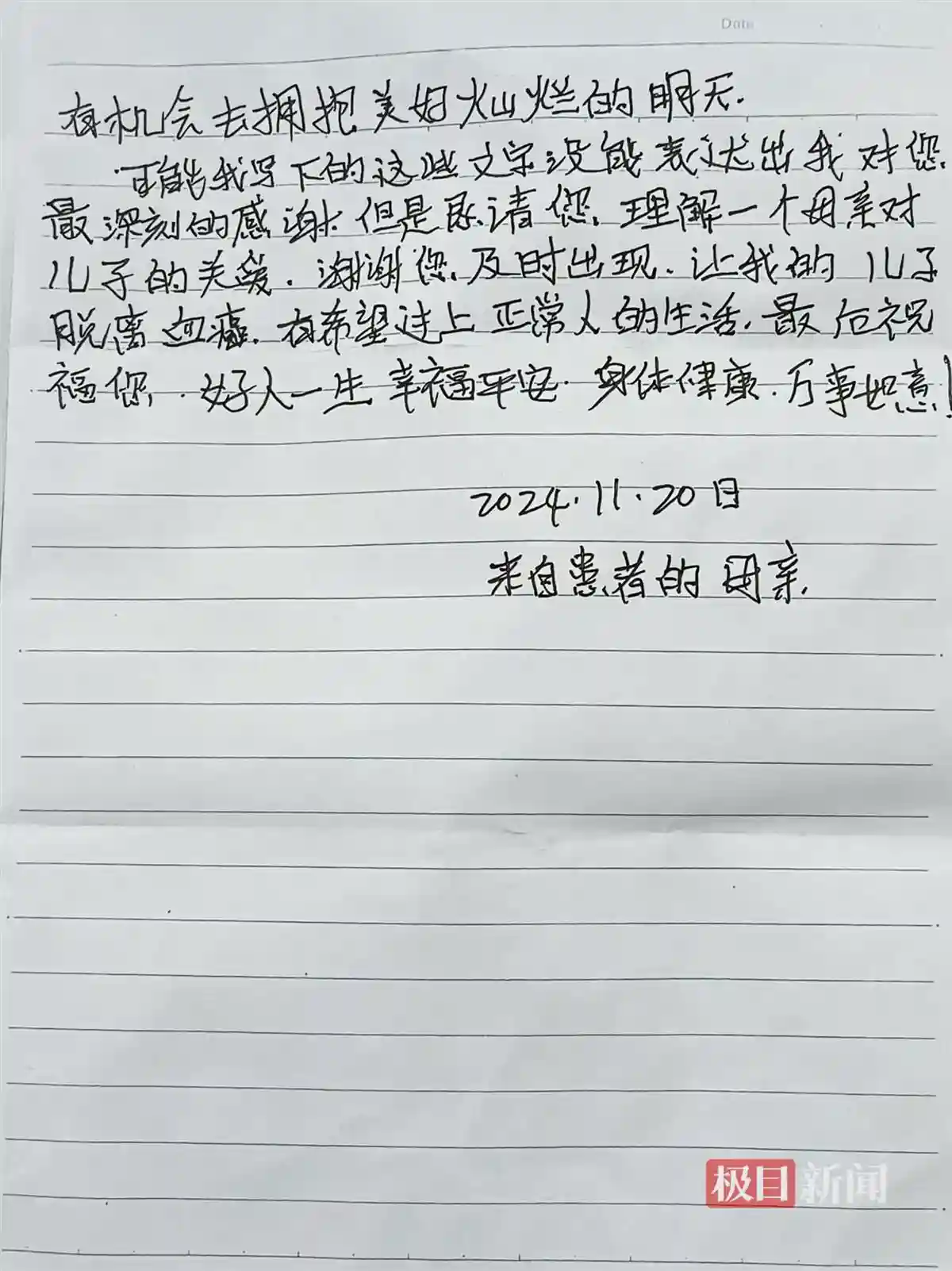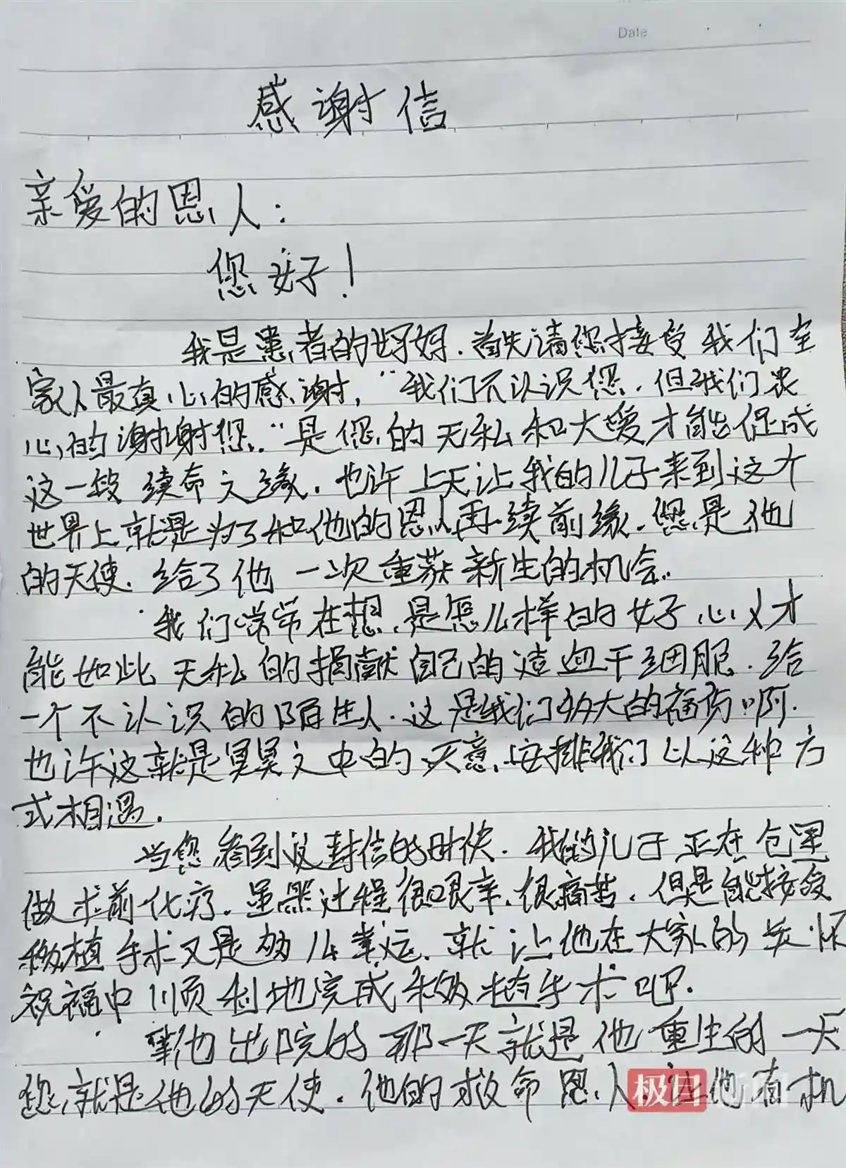 当天,受捐者的母亲也托工作人员送来手写的感谢信,信中深情致谢道:“您的无私和大爱才促成这一段续命之缘分……您是他的天使,给了他一次重获新生的机会……祝您好人一生幸福平安。”