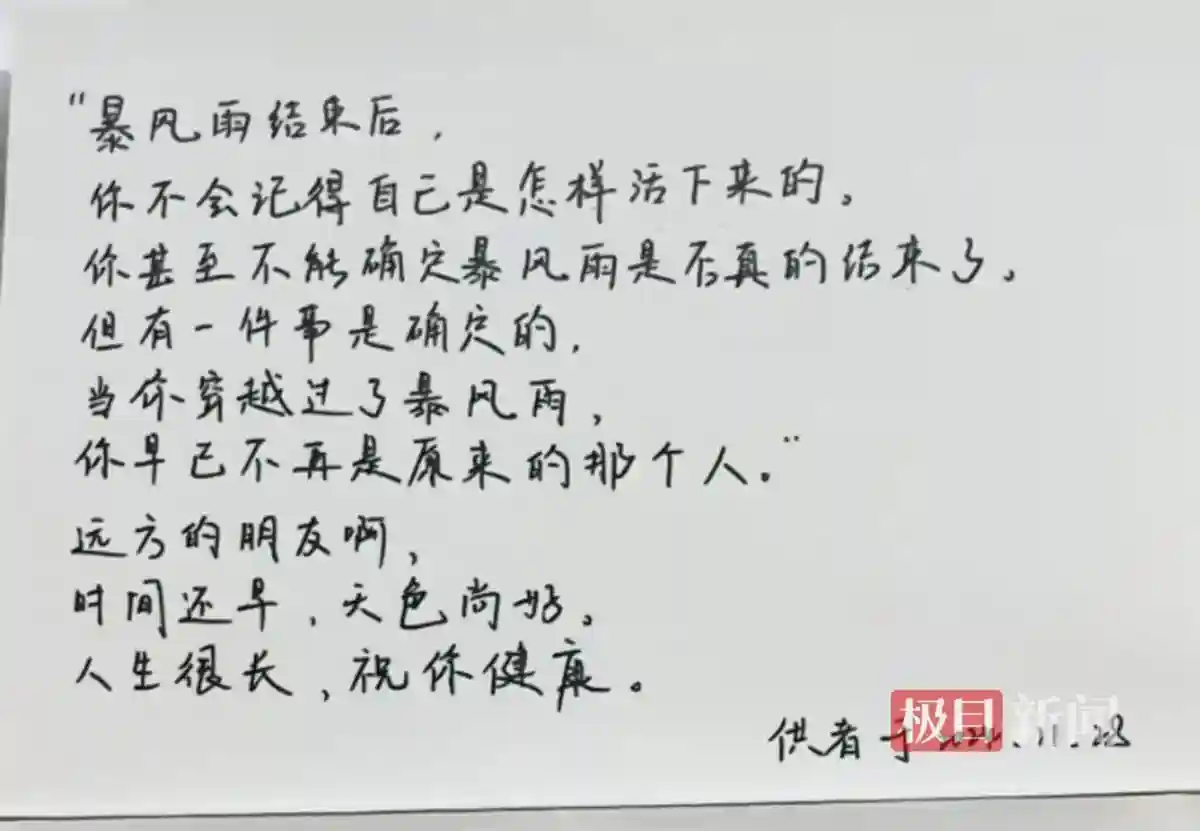 对此,豆豆也为受捐者送上手写的祝福:“当你穿越了暴风雨,你早已不再是原来的那个人。远方的朋友啊,人生很长,祝你健康。”