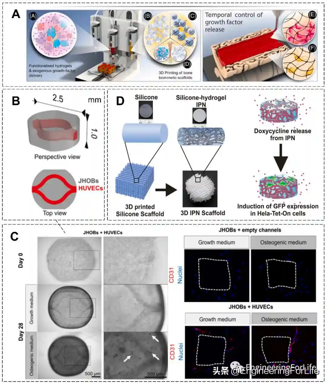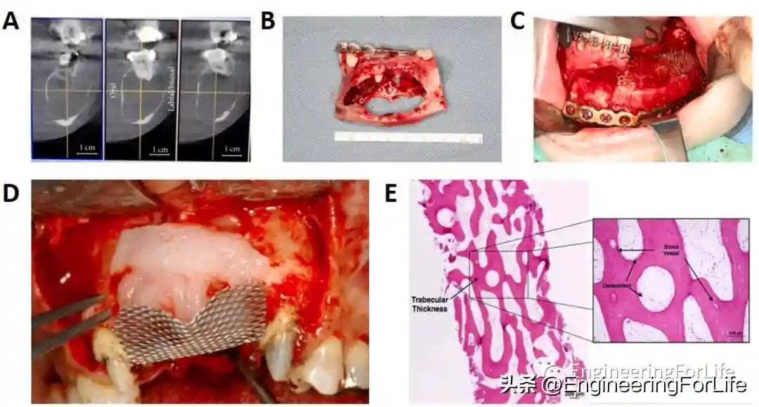 在结合生长因子方面,骨形态发生蛋白(BMP)、胰岛素生长因子(IGF)、成纤维细胞生长因子(FGF-2)、转化生长因子-β(TGF-β)、基质细胞衍生因子1(SDF-1)、血管内皮生长因子(VEGF)和神经生长因子等骨诱导和血管生成因子在下颌再生中起着关键作用,并已被水凝胶系统包裹,在临床上,使用含有BMP-2的传统钛网胶原凝胶可实现更好的下颌重建(图5)。
