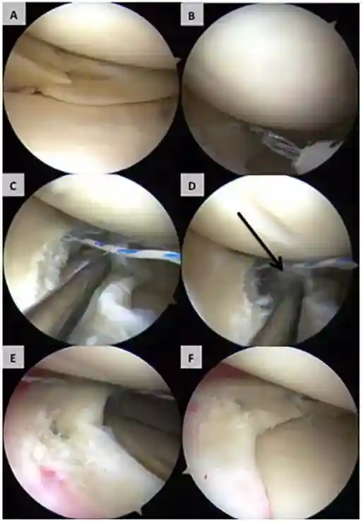 图解(一位患者的术中关节镜图像显示的人间充质干细胞的植入方法)
