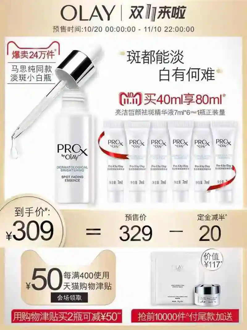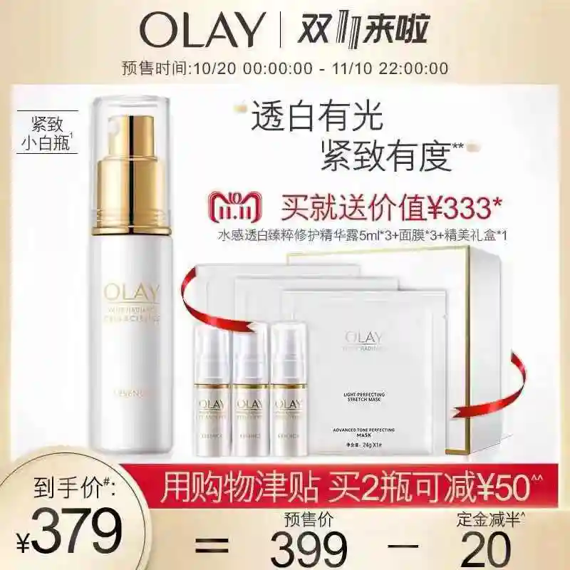 双十一期间Olay小白瓶家族,在天猫旗舰都有优惠活动,复制淘口令:¥n3tZb7xJdHn¥打开手机淘宝,大家可以根据自己的问题,选择适合自己的小白瓶,还可以搭配瓶面膜和OLAY小白伞,加倍放大美白效果。
