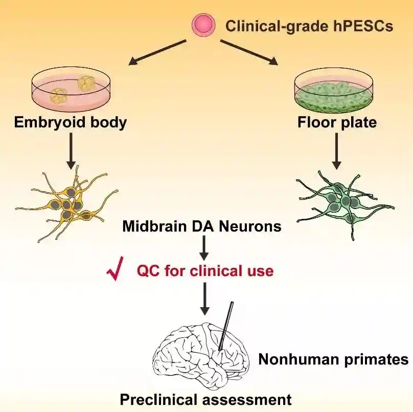 临床级人胚胎干细胞分化的多巴胺神经细胞的临床前评价示意图(WangYKetal.,StemCellReports,2018)