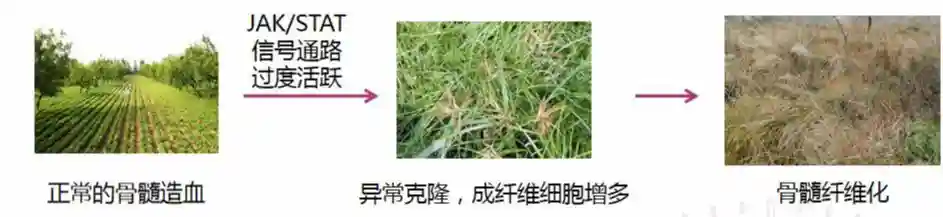 通俗地讲,骨髓腔好比是一块田地,可以为人体生产各类血细胞,但是因在播种过程中撒下了有问题的种子(骨髓造血干细胞异常克隆),使农作物生长的同时还会长出杂草(成纤维细胞增多)。由于田地面积有限,越来越多的杂草取代了农作物,导致作物产量不均衡甚至严重下降(造血异常),从而引起各类症状。