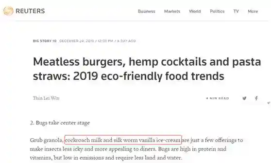 路透社报道还称,昆虫富含蛋白质和维生素,但排放量低,需要的土地和水也更少。