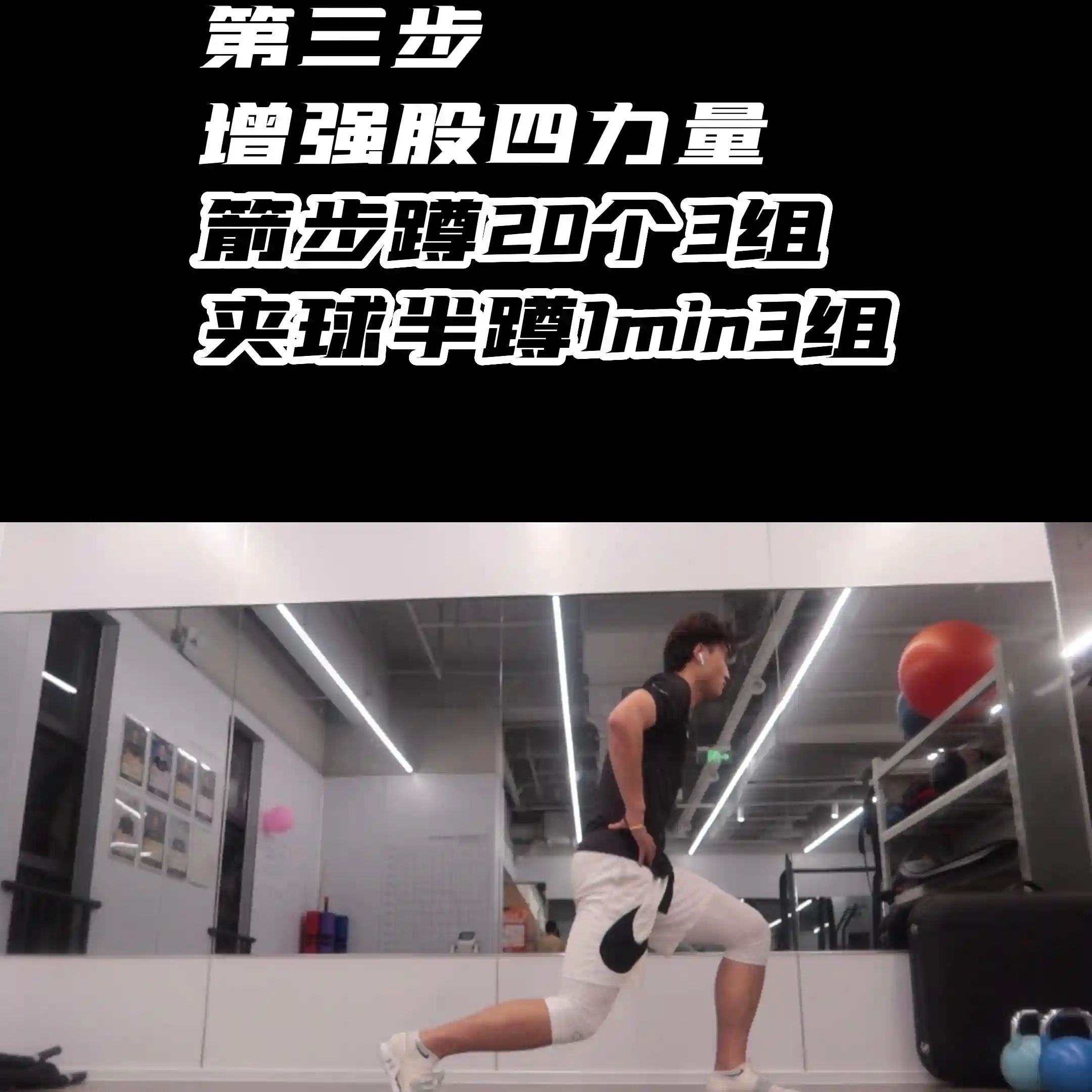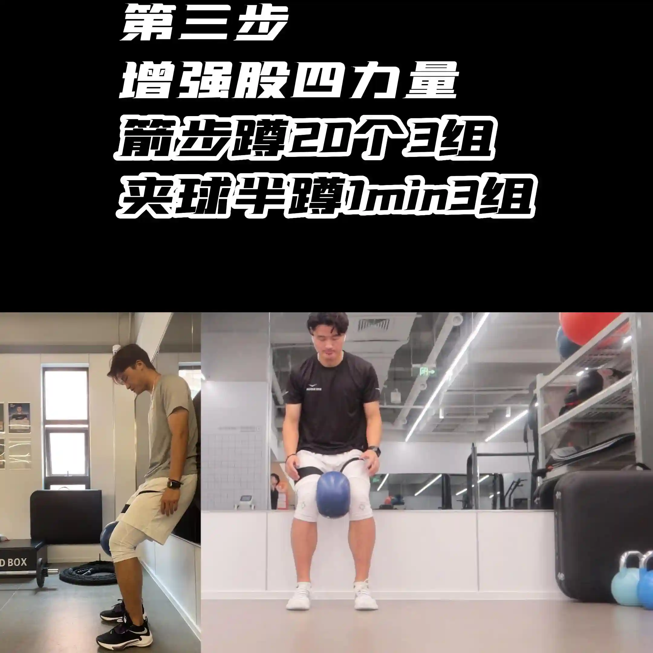 ·第3步,增强股四力量。箭步蹲20个3组,夹球半蹲1min组。接着就可以去增强股四的力量。动作选择箭步蹲,这个动作足膝髋都有在参与,又练股四的力量又有三者联动,也可以选择夹球半蹲。也是老朋友了跑跳的黄金动作。