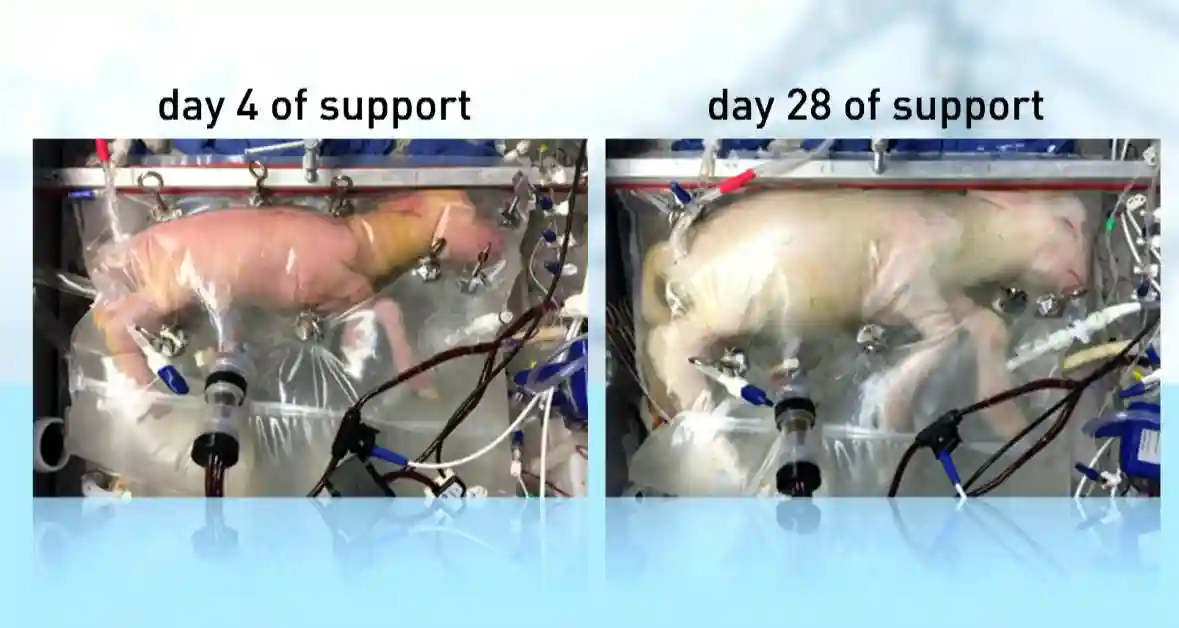2017年,美国费城儿童医院的研究团队,用聚乙烯薄膜(塑料袋)模拟了8个哺乳动物的人造子宫。人造子宫里面是110天大的超早产羊羔,相当于人类23周左右的早产儿。