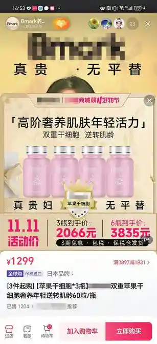 在线上电商平台,各类“干细胞产品”同样让人眼花缭乱。记者在一家海外旗舰店的直播间看到,销售人员正在推销一款苹果干细胞产品。