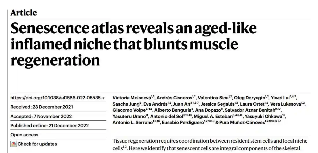 最近,一家抗衰老研究公司AltosLabs的研究人员与来自西班牙、中国、日本、美国和卢森堡的国际研究团队,发表了一篇名为“老化细胞谱系图揭示了老年化的炎性环境对肌肉再生的抑制作用(Senescenceatlasrevealsanaged-likeinflamednichethatbluntsmuscleregeneration)”的研究论文,刊登在了《自然》杂志上。