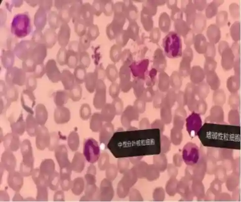 血涂片特点:外周血白细胞数增多,晚幼粒细胞及嗜碱性分叶粒细胞多见。淋巴细胞比例减低,红细胞形态未见异常。未见血液寄生虫。不排除慢性髓系白血病,建议做骨髓细胞学检测。