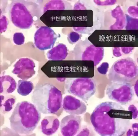 骨髓增生极度活跃,细胞分类与外周血相似,可见到各期粒细胞,其中以中、晚幼粒细胞为主,嗜酸和嗜碱性粒细胞多见,红细胞系相对减少,粒:红约14.08。中性粒细胞碱性磷酸酶阳性率和积分减低,Ph染色体和BCR-ABL融合基因阳性,最终确诊为CML。