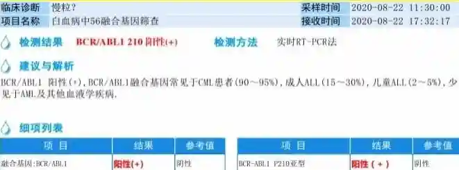 本案例血常规显示患儿白细胞数升高,体格检查未见肝脾肿大,与类白血病反应外周血白细胞显著增高[6]表现一致。该患儿嗜碱性粒细胞的绝对数是增多的,因而可初步将两者区分开。[7]临床上对其进行Ph染色体和BCR-ACL融合基因相关的实验室检查,结果显示为阳性,该患儿确诊为CML。