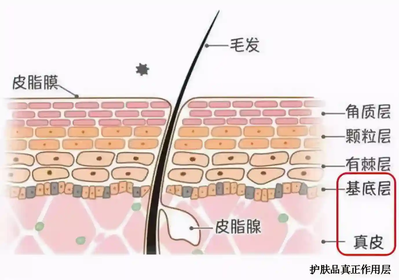 这意味着5层以上的死去的无核细胞为我们的身体提供着保护,再加上皮脂腺分泌的皮脂,连水分子都很难通过,更何况体积较大的细胞呢?无法吸收,也就谈不上效果了。