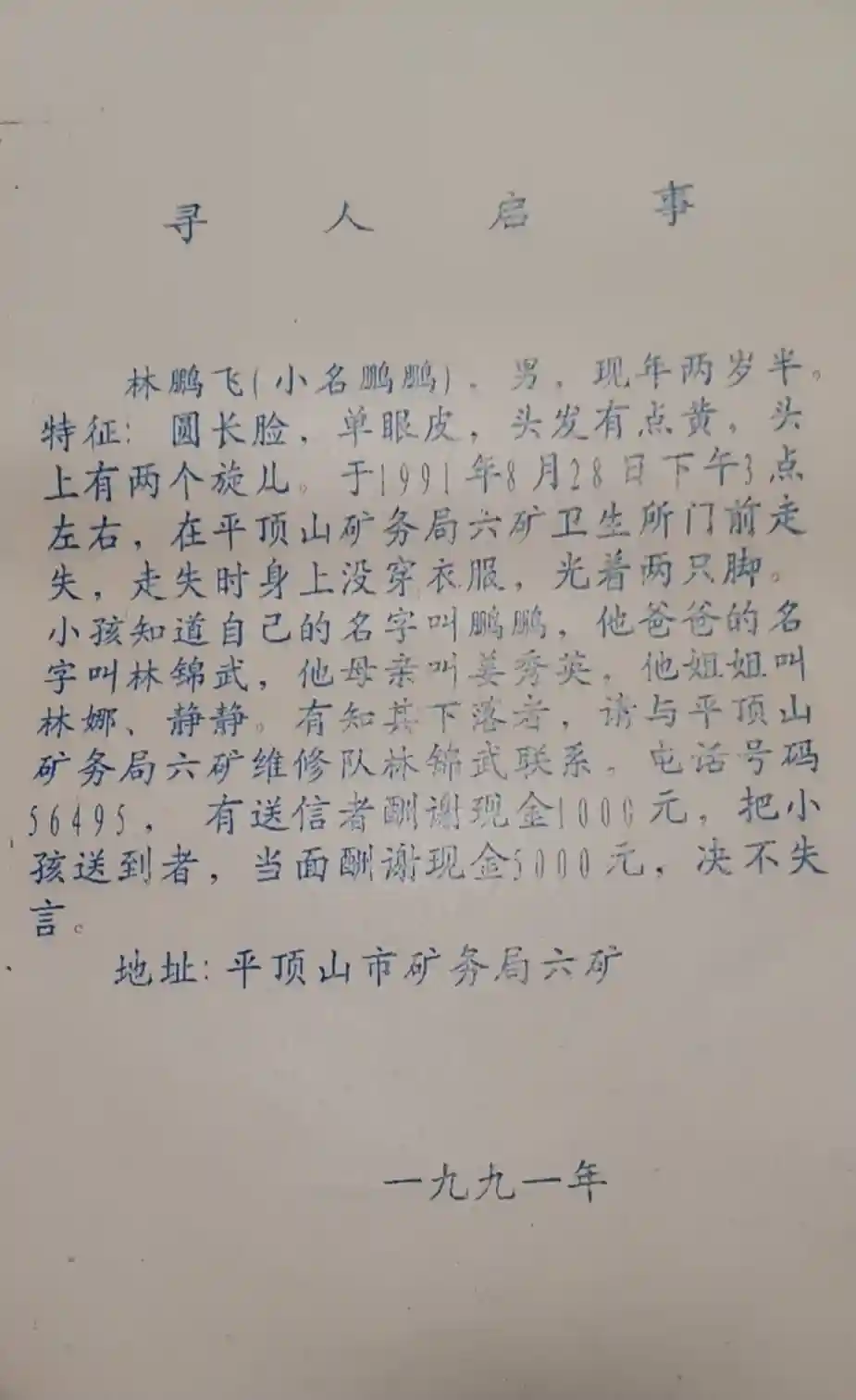 家住河南省平顶山市的林锦武,是平煤神马集团六矿退休职工,今年60岁。1991年8月28日中午,林锦武在床上和2岁半的儿子林鹏飞一起午休,醒来后,发现儿子不见了。
