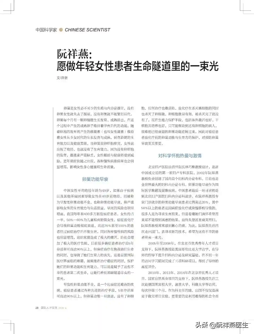 北京妇产医院由首任院长林巧稚教授设计,是新中国成立后的第一家妇产专科医院。2002年阮祥燕教授负责创建了国内首个妇科内分泌专科,目前也是全世界最大的妇科内分泌专科。卵巢功能早衰作为国际医学难题及疑难疾病,中国患者最后一站寻求的是到北京妇产医院妇科内分泌科就诊。在阮祥燕教授专家门诊就诊的卵巢功能早衰患者比例高达20%,其中50%以上的患者是因癌症放化疗或骨髓移植导致的。很多人是为寻求生育而来,但是看着她们满怀希望而来却不能得到满意的结果,最终失望甚至痛哭而归,阮祥燕教授常常感到揪心的痛。为此,阮祥燕先后四次走出国门,去寻求新的技术,希望为这些不幸的患者带来一束光。
