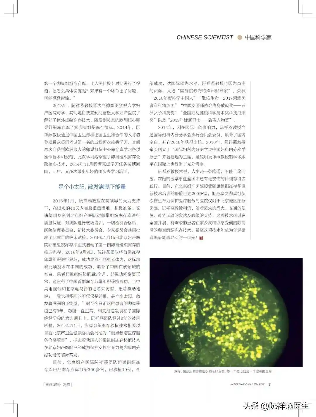 目前,北京妇产医院阮祥燕团队卵巢组织冻存库已经冻存卵巢组织300多例,已移植10例,全部成功,达国际领先水平。阮祥燕教授也因为杰出的贡献,入选“国务院政府特殊津贴专家”,荣获“2018年度科学中国人”“敬佑生命·2017荣耀医者专科精英奖”“中国女医师协会终身成就奖——五洲女子科技奖”“全国妇幼健康科学技术奖科技成果奖”以及“2019年健康卫士——致敬人物奖”。