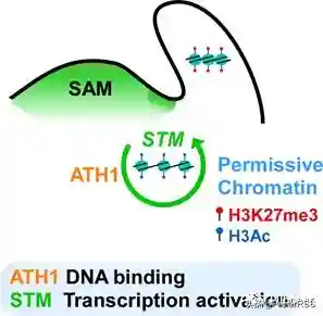 ATH1基因编码的转录因子,与STM所编码的转录因子存在蛋白互作。随后一系列分子生化实验表明,ATH1可以直接结合STM基因位点,并且ATH1对STM基因的激活作用显著依赖于STM蛋白本身。基于上述结果,得到一个依赖于ATH1蛋白的STM自激活调控回路。在STM自激活调控中,ATH1蛋白具有DNA结合作用,STM蛋白具有转录激活作用,ATH1-STM以复合体形式实现STM自激活调控。进一步研究发现,STM的表达维持STM位点的染色质处于开放状态,使得在后续发育中STM的表达能够进一步激活,从而形成侧生分生组织。